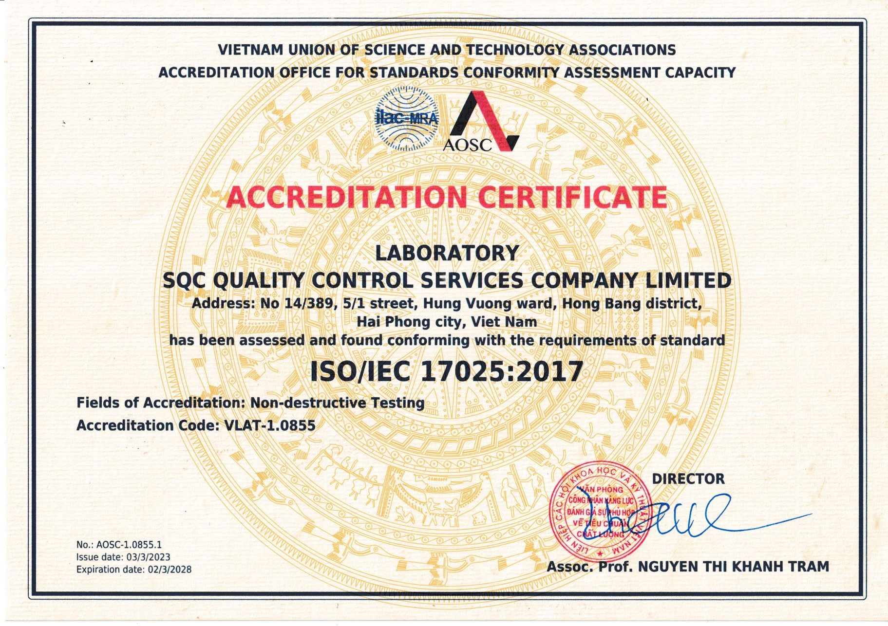 SQC được công nhận bởi các tổ chức có thẩm quyền trong và ngoài nước như: ISO 9001,ISO/EC 17025:2017 ILAC/APAC MRA, BV, LR, ASNT…